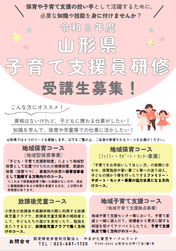 保育や子育て支援の担い手として活躍するために、子育て支援員研修を受講して必要な知識や技能を身に付けませんか?詳しくは山形県庁ホームページの下記サイトをご覧ください。https://www.pref.yamagata.jp/010001/kenfuku/kosodate/shien/kosodake-shienin-kenshur2.html【募集期間】地域保育コース@、地域保育コースC、放課後児童コース:5月11日(月)〜5月25日(月)地域保育コースA、B、地域子育て支援コース:7月1日(水)〜15日(水)●研修に関するお問合せ認定特定非営利活動法人 やまがた育児サークルランド 子育て支援員研修担当電話:023-687-1720