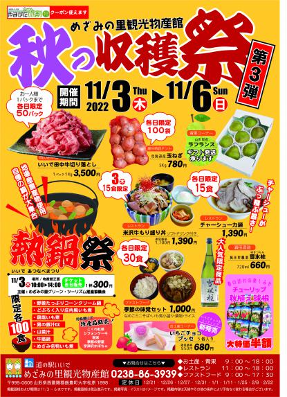 ![]() 11/3は飯豊町熱鍋祭!!そして3〜6日までは今年最後の秋の収穫祭を開催します。 ラフランスも10/25〜販売が開始されその他食べ物や秋植え球根、大人気田中牛の切り落としや玉ねぎなどお買い得商品を多数取り揃えて皆様のお越しをお待ちしております! 2022.10.28:Copyright (C) 道の駅いいで めざみの里観光物産館
