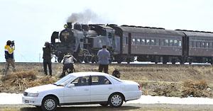 大きな汽笛とともに、出発進行。参加者たちは、沿道から手を振る人たちに手を振り返したり、窓から見える残雪の田園風景を堪能していた。沿線ではSLの勇姿をカメラに収めようとする人も。