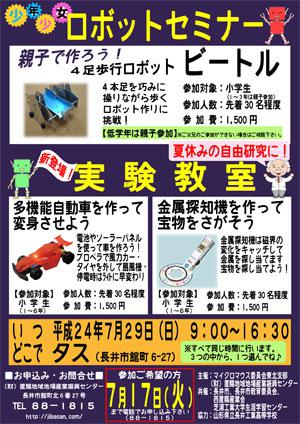 今年も夏休みに少年少女ロボットセミナーを開催します!日時は7月29日(日)9:00〜16:30です。スポ少の合宿に子ども会行事、家族旅行…夏のプランはたくさんあると思いますが、小学生のみなさんにぜひ参加してもらいたい恒例のイベントです(*゚▽゚*)なんと、今年で12回目となりますv('▽^*)●少年少女ロボットセミナーの内容は、『ビートル』ちょっと難易度高めなので、小学校低学年(1-3年生)はお家の方と一緒に参加して下さい♪ご父兄の参加がご無理な場合は長井工業の生徒さんが手伝いに来てくれますので、事前に教えてくださいね(*^-^*)高学年のみなさんはお友達と一緒に参加でもOKです(*^-^)b▼昨年の様子今回新登場の『実験教室』もあります!実験教室は2種類のコースがあります。・『多機能自動車を作って変身させよう!』・『金属探知機を作って宝物をさがそう!』どちらも難易度は低めです〜(どっちも挑戦したい場合はご相談下さい!)セミナー、実験教室は同じ日・同じ時間に行います。ロボットセミナー「ビートル」か実験教室「自動車」「金属探知機」の3つから、1つを選んで申し込んでください。第12回少年少女ロボットセミナー開催日:平成24年7月29日(日) 1日のみ時 間:9:00〜16:30場 所:タス2階参加費:1,500円申 込:財団法人置賜地域地場産業振興センター(長井市タスビル2階)電 話:0238-88-1815※申込締切は7月17日(火)です。1日通しての開催ですので、お弁当を持ってきて下さいね♪ものづくりの心を育み、機械製作のわくわくを体験できるロボットセミナー。工業大学の教授や工業高校の先生と生徒さんが優しく指導&お手伝いしてくれます。夏休みの自由研究として参加してみてはいかがですか(*^-^*)*゜?。+*?*゜?。+*?*゜?。+*?*゜?。+*?*゜?。+*?*゜?毎月1日・15日にファン倶楽部会員様へメールマガジンを配信中♪▼お申込はこちらから!▼twitter▼お買物はここ!ネットショップやまがたタス物産館※会員登録してからお買い物するとオトクですよ♪ 新規入会で300pt進呈中です(〃〃)