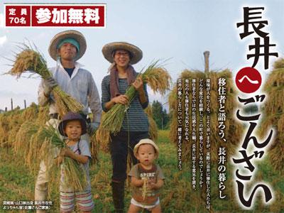 いま、長井市では移住・定住促進事業が取り組まれています。こちらのブログでもご協力をお願いしているアンケートもそのひとつ!1週間前にはモデルプランの移住体験が行われ、希望された方に実際に長井に来ていただき、生活をしていただきました(*^-^*)長井市移住交流ポータルサイト『田舎暮らし ごんざい』もあります♪そして、今回は!!実際に移住して長井に住んでいる方と語る会が開催されます(*゚O゚)ノ長井でどんな変化を経験し、この長井で暮らしているのでしょうか?様々な視点から“長井の暮らし”を考えてみませんか。≪詳しい内容≫●日時:平成24年12月1日(土) 午後1:00〜午後4:00●会場:伊佐沢公民館(長井市上伊佐沢7312)●移住者によるブース出展と交流(午後1時〜午後1時30分) 移住者のつくった野菜や食品、お菓子、雑貨などの試食や体験、販売コーナー●講話(午後1時40分から) 「県内に広がる新たなライフスタイル-農と食のある暮らし」 講師:Gozzo山形 代表 佐藤智也氏●体験報告・ディスカッション(午後2時10分から)≪お問合せ≫長井まちづくりNPOセンター TEL 0238-87-0239長井市企画調整課 TEL 0238-87-0817◎こんな方におすすめ◎・県外・市外から移住や転勤した方とつながりたい方・長井に住むことをお考えの方・農や食、住まいに関心をお持ちの方興味をもたれた方、どなたでもご参加ください♪*゜?。+*?*゜?。+*?*゜?。+*?*゜?。+*?*゜?。+*?*゜?☆アンケートのお願い☆長井市で“田舎暮らし”の意向アンケートを行っています。まだまだ受付ております。ご協力お願いいたします。*゜?。+*?*゜?。+*?*゜?。+*?*゜?。+*?*゜?。+*?*゜?毎月1日・15日にファン倶楽部会員様へメールマガジンを配信中♪▼お申込はこちらから!▼twitter▼お買物はここ!ネットショップやまがたタス物産館※会員登録してからお買い物するとオトク♪ポイントが貯まります!