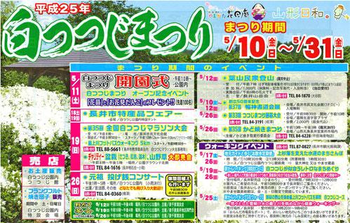 桜が舞い散り、桜の木には青葉が見える頃となりました。ゴールデンウィークの連休にはたくさんの方が長井市にいらっしゃったようですが、次は「白つつじ」の時季です!▼つぼみも育っています♪白い花が咲くまでにはまだ時間がかかりそうですが、長井市にある松ヶ池公園(通称:白つつじ公園)で5月10日(金)から『白つつじまつり』が開催されます!▼見ごろを迎えると…雪のように真っ白な花に囲まれます(*^-^*)≪まつり期間中のイベントをご紹介≫●5月11日(土)午前10時〜 白つつじまつり開園式 ★花苗と団子を先着100名様にプレゼント!●5月17日(金)午後6時〜8時 黒獅子まつり前夜祭●5月18日(土)午後1時〜 第24回ながい黒獅子まつり●5月18日(土)・19日(日) 長井市特産品フェアー(公園内特設テント)●5月19日(日) 第35回全国白つつじマラソン 最上川フットパスウォーキング●5月19日(日) チャリティー盆栽、山野草即売会 ●5月26日(日)午後1時〜5時 元祖 投げ銭コンサート(公園内) ※同日午前9時30分から体験田植えも!(花作公民館集合)●期間中の土・日は公園内でフランクフルトや焼き団子の販売があります。●5月12日(日)・19日(日)・26日(日)の午前10時〜午後4時 野だて茶会(※小雨決行)≪つつじ公園以外の会場≫○5月12日(日) 葉山民衆登山(はぎ苑集合)○5月10日(金)〜12日(日) 暢神書道会展(長井市民文化会館) ○5月26日(日)午前9時30分〜つつじまつり囲碁大会(生涯学習プラザ)○5月26日(日)午前10時〜午後3時 かど焼きまつり(山形丸魚長井営業所内)≪ウォーキングイベント≫◎5月17日(金)〜26日(日) 地元ガイドと歩く「お散歩定期便」 上杉藩を支えた水運のまちさんぽ◎5月19日(日)〜26日(日) 駅からハイキング【期間設定コース】 白つつじが似合うレトロなまちめぐち◎5月25日(土) 駅からハイキング【花ウォーク】 新緑の西山を眺め最上川フットパスを満喫 白つつじコース※ウォーキングイベントのお問合せは長井市観光振興課(0238-87-0827)まで。とっても楽しい1ヶ月です!ぜひ、5月の長井に遊びに来てください(^O^*)【ながいファン倶楽部会員募集中!】☆毎月1日・15日にファン倶楽部会員様へメールマガジンを配信♪▼お申込はこちらから!