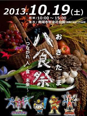 またまた10月19日(土)のイベントです(@@)ながい産業フェア、フラワー長井線祭り、そして「おきたま八食祭」!! おきたま八食祭は、置賜の3市5町から自慢のおいしいものが一堂に集結!さらに置賜の全18蔵の日本酒と全6社のワインも勢揃いします。置賜の秋の味覚を満喫できるイベントです♪置賜のご当地ヒーローやゆるキャラも大集結するそうです。日時:平成25年10月19日(土) 10:00~15:00会場:南陽市中央花公園「南陽の菊まつり」会場長井市からは4つの屋台が出店(*^▽^*)・昔ながらの手づくりハム 「草岡ハム加工組合」・郷土料理、かあちゃんの味 「夢蔵」・体にも心にもやさしいおやつ 「よっちゃん堂」・米粉を使った可愛いお菓子 「パン工房 jiem」どのお店も長井の自慢のおいしさです!全体では、8市町から24団体が出店予定です。こちらもぜひ足を運んで見てくださいね〜♪お問合せは、置賜八食祭実行委員会まで(TEL0238-23-3246) 【ながいファン倶楽部会員募集中!】☆毎月1日・15日にファン倶楽部会員様へメールマガジンを配信♪▼お申込はこちらから!