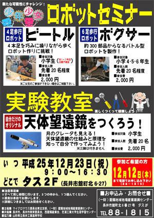 少年少女ロボットセミナー&実験教室を開催します(=^▽^=)毎年夏休み中に開催していましたが、13回目の今回は”冬”に!開催日は 平成25年12月23日(祝) 9:00〜16:30 です。ものづくりの心を育み、製作のわくわくを体験できるロボットセミナー&実験教室。小学生のみなさんにぜひ参加してもらいたいイベントです!≪昨年の様子≫少年少女ロボットセミナーのコースは2種類、実験教室は1種類。◆ロボットセミナー◆4足歩行ロボット『ビートル』 4本脚を巧みに操りながら歩くロボットを作ります。 ・対象:小学生(※1~3年生はお家の方と一緒に参加してください) ・参加費:2,000円 ※ご父兄の参加がご無理な場合は長井工業の生徒さんが手伝い に来てくれますので、事前に教えてくださいね(*^-^*) ※高学年のみなさんはお友達と一緒に参加でもOKです(*^-^)b◆ロボットセミナー◆6足歩行ロボット『ボクサー』 約300個の部品から、バトル型ロボットをつくります。 ・対象:小学4,5,6年生 ・参加費:2,000円◆実験教室◆天体望遠鏡をつくろう 天体望遠鏡の仕組みと原理を学びながらつくります。 ・対象:小学生 ・参加費:2,000円 3つのコースの中から1つ選んでお申込みくださいね☆第13回少年少女ロボットセミナー・実験教室開催日:平成25年12月23日(祝)時間:9:00〜16:30場所:タス2階 (バンケットホール)参加費:各2,000円 ☆チラシはこちらから(PDF)◆お申込み・お問合せ◆置賜地域地場産業振興センターで受付けています。お電話(0238-88-1815)でご希望をお伝えください。お申込みの締切は 12月12日(木) です。※1日通しての開催です。お昼は各自ご準備ください。【ながいファン倶楽部会員募集中!】☆毎月1日・15日にファン倶楽部会員様へメールマガジンを配信♪▼お申込はこちらから!