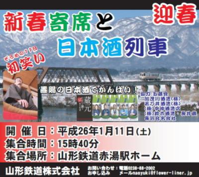 ぞろめの1月11日、初笑いしませんか(*^-^*)なんと、俊風亭太平氏による新春寄席がフラワー長井線の車両で開催されますΣ(゚ロ゚*)開催日:平成26年1月11日(土)集合時間:15時40分集合場所:山形鉄道赤湯駅ホーム参加費:4,200円お申込み・お問合せ:山形鉄道 TEL 0238-88-2002気になる内容は・・・・俊風亭太平氏による新春寄席・五蔵会5種類の地酒(各1杯)・小料理(焼き物、揚げ物、汁物、漬けものなど)・フラワー長井線1日乗り放題チケット※持ち込み自由≪詳しくはチラシをご覧ください(PDF)≫置賜の日本酒でカンパイ!ほろ酔い気分で初笑いヽ(≧▽≦)ノフラワー長井線“ワイン列車”に続き、“日本酒列車”の運行楽しみです♪【ながいファン倶楽部会員募集中!】☆毎月1日・15日にファン倶楽部会員様へメールマガジンを配信♪▼お申込はこちらから!