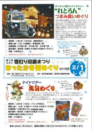 2月1日のながい雪灯り回廊まつりイベントが続々発表されています♪そのひとつが「あったか冬街めぐり-ガイド付き」!(チラシはこちら:PDF)A)ボンネット型ロンドンタクシー"れとろん"に乗って「つまみ食いめぐり」 いろんなところにイベント会場がある雪灯り回廊まつり。行ってみたいけど、 冬道を歩くのは・・・という方にオススメのコース(*^-^*) 体があたたまる「うんまぇもの」をつまみ食いしながら、ガイドの楽しい話付 の1時間のミニツアー♪ れとろんからの雪灯り景色は格別(*゚O゚)b ●参加料:1000円(つまみ代、乗車代含む)※超オトク価格らしいですよ♪ ●募集人数:21名(定員7名、3便運行) ●出発時間:1便-5時、2便-6時、3便-7時 ●集合場所:長井駅(出発10分前に集合) ●対象:小学生以上 ★事前申し込み、当日も空きがあればOK! ★1月20日から申込受付中!!(長井まちづくりNPOセンター0238-87-0239)B)ナイトツアー 馬旨めぐり うま年の2014年!バーニックも張り切ってるそうです♪ スノーランタンの灯りにつつまれながら、長井特有の「馬肉メニュー」を つまみ食いしながら歩くコース! 普段と違う夜道に新発見があるかも? ●参加料:1000円(つまみ代、ドリンク代含む) ●募集人数:10名 ●出発時間:午後5時30分 ●集合場所:長井駅(5時集合)※解散は長井小学校 ●対象:20歳以上 ★事前申し込み ★1月20日から申込受付中!!(長井まちづくりNPOセンター0238-87-0239) ≪あったか冬街めぐり ルート≫おいしそうなイベントです!参加してうんまぇものと景色を一緒に味わってください(*^-^*)タスの前もルートに入ってます♪ 皆さんが見に来てくれるのを楽しみに、雪灯りを作って灯してがんばります(p*^-^*)q 道路沿いを灯すので、じっくり見てくださいね(*゚O゚*)【この記事は、ながいファン倶楽部のブログです】 ☆毎月1日・15日にメールマガジンを配信しています♪ ご希望の方は会員登録をお願いします。