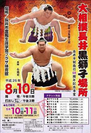 長井市制施行60周年記念事業『大相撲長井黒獅子場所』が開催されます!●い つ 8月10日 日曜日 開場午前8時 打出し(終了予定)午後3時●どこで 置賜生涯学習プラザ体育館●チケット先行販売 5月10日、11日午前10時〜午後3時●販売場所 長井商工会議所会議室(タス1階)●お問合せ 長井市総務課(0238-84-2111)長井市で約50年ぶりに開催される大相撲地方巡業です。前日8月9日(土)にはながい水まつり・最上川大花火大会も行われます。ぜひこの機会に長井を訪れ、イベントを楽しんではいかがでしょうか(*^-^*)*+:。:+* ゚ さくら通信 2014 ゚ *+:。:+*4月22日(火)、時折強い風が吹く曇り空。最上川堤防沿いの桜たちは、見ごろを迎えています♪▼リボンの桜 咲いたと思ったら一気に満開です!▼4月22日の千本桜▼のんびりと散策される方も▼上から!久保桜も咲き始めました!▼朝▼午後 午前中より咲いたような♪ ツアーの方も増えてきました。 【この記事は、ながいファン倶楽部のブログです】▼長井の情報いっぱいのブログは公式サイトから! ☆毎月1日・15日にメールマガジンを配信しています♪ ご希望の方は会員登録をお願いします。