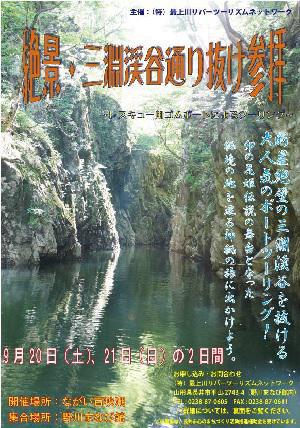 レスキュー用のゴムボートを使って断崖絶壁の三淵渓谷を通り抜け卯の花姫伝説の舞台となった秘境の地を巡る神秘の旅にでかけませんか。開催日:平成26年9月20日(土)、21日(日)場所:ながい百秋湖集合:野川まなび館定員:各回10名(ゴムボート1艇につき6名乗船、内1名スタッフ)参加費:大人2000円、小学生以下1500円≪チラシはこちらから≫■タイムスケジュール※30分前に整理券が配布されます1回目: 9時30分〜10時30分2回目:10時50分〜11時50分3回目:12時50分〜13時50分4回目:14時10分〜15時10分■申込受付期間 ※完全予約制9月12日(金)〜9月18日(木)(定員に達し次第受付を締切)□お申し込み・お問合せ先 (特)最上川リバーツーリズムネットワーク TEL0238-87-0605(野川まなび館内)神秘的な景色と断崖絶壁が続く水回廊を巡るボートツーリングなんだそうです!参加される方は濡れてもOKな服装でご参加ください♪【この記事は、ながいファン倶楽部のブログです】☆毎月1日・15日にファン倶楽部会員様へメールマガジンを配信♪▼前の記事・お申込はこちらから!