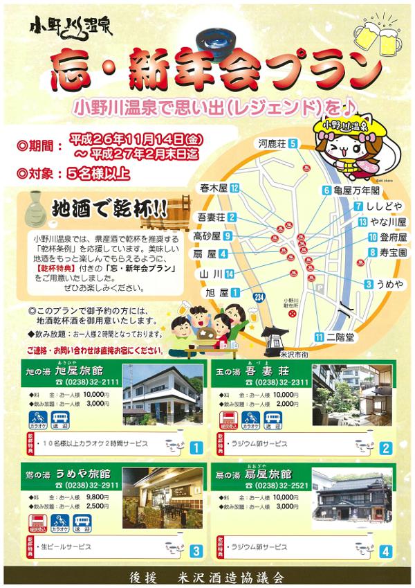 期間:平成26年11月14日(金)〜平成27年2月末日迄対象:5名様以上小野川温泉では、県産酒で乾杯を推奨する「乾杯条例」を応援しています。美味しい地酒をもっと楽しんでもらえるように、【乾杯特典】付きの「忘・新年会プラン」をご用意いたしました。ぜひお楽しみください。◎このプランでご予約の方には、地酒乾杯酒をご用意いたします。◆飲み放題:お一人様2時間となっております。※お問い合わせは直接お宿にご連絡をお願いいたします。