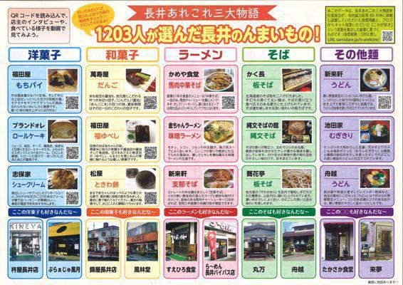去年の3月にブログで紹介&募集した『長井あれこれ三大物語〜長井てゆったらこれだべした!!』うんまいものの集計結果がMAPとなって発表されました(*^‐^*)それぞれの部門で投票の多かった3品は下記の通りっ(*'▽')b≪洋菓子≫ ・福田屋 もちパイ ・ブランドォレ ロールケーキ ・志保家 シュークリーム≪和菓子≫ ・萬壽屋 だんご ・福田屋 福ゆべし ・松屋 ときわ餅≪ラーメン≫ ・かめや食堂 馬肉中華そば ・金ちゃんラーメン 味噌ラーメン ・新来軒 支那そば≪そば≫ ・かく長 板そば ・縄文そばの館 縄文そば ・蕎花亭 板そば≪その他の麺≫ ・新来軒 うどん ・池田家 むぎきり ・舟越 うどん1203人が選んだ長井のんまいもの!として『これが好き』という実数を集計した結果。≪詳しくはこちら≫みなさんの好きなもの、ありましたか(?〜?)気になるお店があったらぜひチャレンジしてみてくださいね♪▼できあがったMAPMAPにはQRコードが付いていて、読み込むとインタビューなどが動画で見ることができます! 【この記事は、ながいファン倶楽部のブログです】▼長井の情報いっぱいのブログは公式サイトから! ☆毎月1日・15日にメールマガジンを配信しています♪ ご希望の方は会員登録をお願いします。