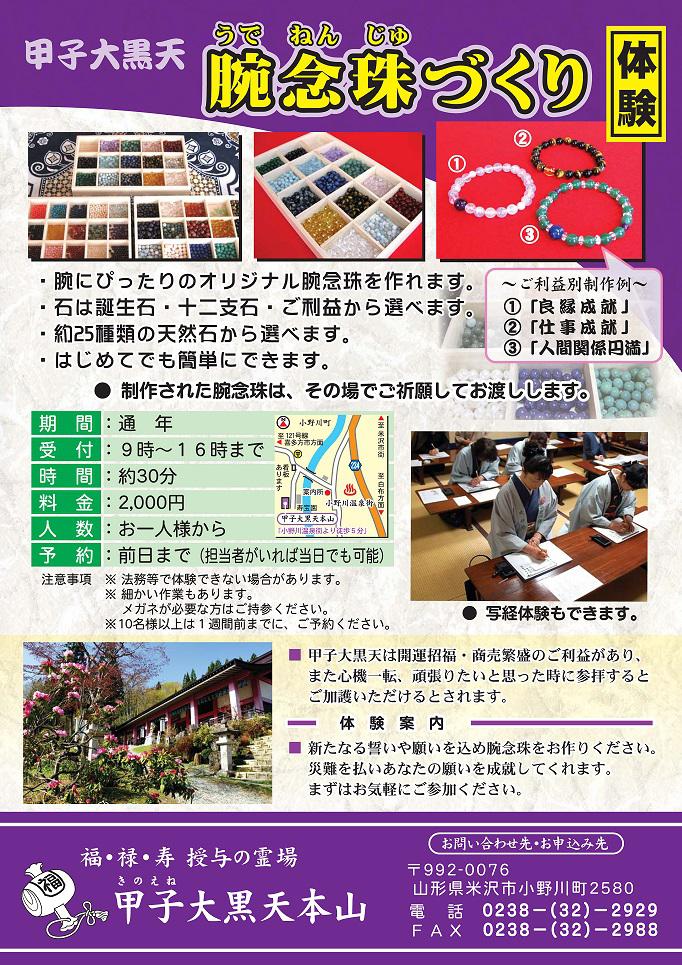 甲子大黒天本山 腕念珠づくり体験が4月より実施されます。