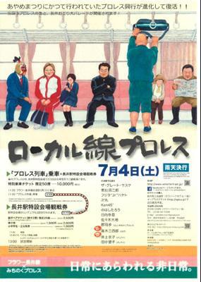 世界初(*^_^*)フラワー長井線でプロレス!?7月4日午前11:50に観客とリングアナ、プロレスラーを乗せた臨時列車が赤湯駅を出発します(*^^)b終着駅の長井駅に着くまでの約25分が試合時間。「車両を壊さない」「乗客にけがをさせない」「列車を止めない」さえ守れば何でもありのルール(@_@;)小道具を仕込んでくる選手もいるかも!?東北地方を拠点に活動する「みちのくプロレス」から、ザ・グレート・サスケ選手や南陽市出身の女子プロレスラー井上京子選手など12人の選手が参戦予定です。バトルロイヤル形式の熱戦を乗客50人の前で披露♪あやめまつりでかつて行われていたプロレス興行が長井駅で進化して復活!!終着駅の長井駅についたら、特設リングで3試合プロレスが行われるんですよ〜♪プロレス終了後「長井おどり大パレード」\(゜ロ\) (/ロ゜)/も行われます。ぜひ長井に足を運んでくださいね。【この記事は、ながいファン倶楽部のブログです】☆毎月1日・15日にファン倶楽部会員様へメールマガジンを配信♪▼前の記事・お申込はこちらから! ※ながいファン倶楽部のブログで使用している写真は、私たちが 一生懸命撮った写真です。勝手にお使いにならないでくださいね♪