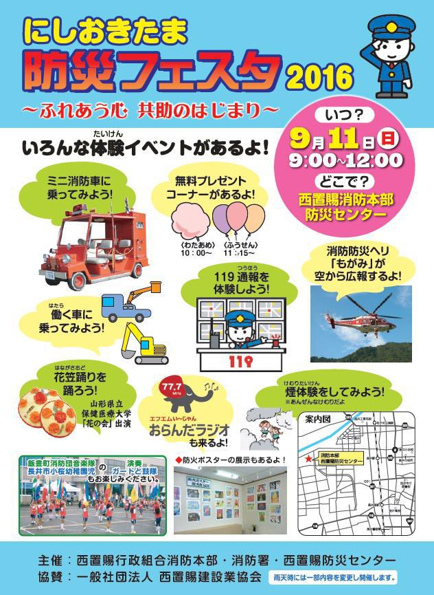 台風一過、日中はまだまだ蒸し暑い日もありますが、天高く過ごしやすい季節になりました。秋はやっぱりイベントの時季ですね。?にしおきたま 防災フェスタ2016?日時 : 9月11日(日) 9:00〜12:00場所 : 西置賜消防本部防災センター桜幼稚園の鼓笛・ガード、わたあめや風船の無料プレゼント、はたらく車大集合などなど、ちびっ子が楽しめる催しや、119番通報体験・煙体験など、防災に役立つ体験イベント盛りだくさん。ご近所の方はぜひ覗いて見て下さいね(*^_^*)一方、遠方で行われる地元主催のイベントも。有楽町の東京交通会館マルシェで、置賜地域の農産物販売を行なうことになりました。?東京交通会館マルシェ出店 ?日時 : 9月11日(日) 11:30〜17:30場所 : 東京交通会館ピロティ1階(東京交通会館マルシェ内)お問い合わせ : 山形県置賜総合支庁 農業振興課 生産流通担当 0238-26-6051シャインマスカット・食用菊・上杉まめなどなど、長井市、高畠町の自慢の農畜産物や加工品が出品されます。またこの出店に先立ち、恵比寿西にあるクリエイティブスペース「amu(アム)」にて、食文化フォーラムが開催されます。置賜産のぶどうとワインの食べ比べ・飲み比べや農産物の試食などがある予定です。行楽シーズン到来、お出かけの際はCHECK IT OUT!【この記事は、ながいファン倶楽部のブログです】☆毎月1日・15日にファン倶楽部会員様へメールマガジンを配信♪▼お申込はこちらから!