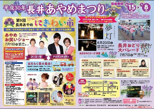 ☆あやめまつり期間☆ 6月15日(金) 〜 7月8日(日) 営業時間 9時〜18時 ※会場の状態やイベントの状況により変更の場合もあります。・オープニングセレモニー 6月15日(金)14時〜 あやめ会館前 ご祈祷・あやめの苗プレゼント(先着100名)あやめまつり期間中の様々なイベントを紹介しま〜す。―6月16日(土)―・長井黒べこまつり 12時〜14時 高台ふれあい広場・高橋兄弟 津軽三味線ライブ 14時〜 水上ステージ―6月17日(日)―・あやめ釣り大会 7時〜8時 園内竹林周辺池・「長井」カラオケ会歌謡ショー 15時 水上ステージ―6月22日(金)―長井あやめ大華展 【展示期間 22日〜24日 10時〜16時30分】 丸大扇屋―6月23日(土)―夢灯(ゆめあかり) 16時30分〜20時30分・点火式セレモニー 16時55分 園内・長井オカリナ―ズ演奏 ―6月24日(日)―・長井あやめ写生大会 9時〜12時 園内・長井出身モデル菊池実季さん あやめと一緒に写真を撮ろう! 10時〜 園内・猿舞座公演 午後予定☆長井あやめにぎわい市☆ 9時30分〜16時 あやめ会館前―6月30日(土)― ・じゃんけん大会 11時45分〜 特設ステージ・總宮神社 黒獅子舞披露 1回目10時〜、2回目13時15分〜 あやめ会館・はたらく車大集合! 10時〜15時 北口特設会場・ふうせんたけさん ショー 1回目10時45分、2回目14時15分 あやめ会館前 ―7月1日(日)―・あやめお笑いショー 12時〜 水上ステージ (出演 アイデンティティ、フースーヤ)・じゃんけん大会 14時30分〜 特設ステージ・總宮神社 黒獅子舞披露1回目 10時〜、2回目14時〜 あやめ会館前・井上千春&塚原姉妹ライブ 13時〜 特設ステージ ―7月7日(土)―・長井おどり大パレード 18時30分〜(予定) 駅前通り・出張!赤ちょうちん屋台 17時30分〜20時30分 市役所市民駐車場上記以外にもいろんなイベントが盛り沢山です。☆詳しくはこちら☆ご家族みんなで楽しむことが出来る企画でいっぱい♪まつり期間中は、あやめ公園に足を運んでみてくださいね(*^^)v【この記事は、ながいファン倶楽部のブログです】