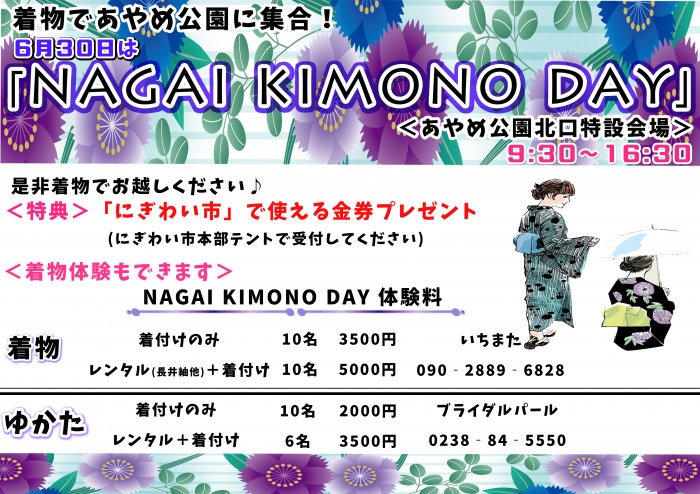 続々と開き始めたあやめたちによる美しさの饗宴(*^_^*)着物に装い、今真っ盛りの「あやめ公園」で花々とのコラボはいかがですか?6月30日(日)のあやめにぎわい市にて「NAGAI KIMONO DAY」が開催されます(o・ω´・b)b日時:6月30日(日)時間:9:30〜16:30場所:あやめ公園北口特設会場着物・浴衣でお越しいただいた方へは特典として、「にぎわい市」で使える金券をプレゼント!(甚平はNG)受付はにぎわい市本部テントで行われます。手ぶらで、着物体験もできます!着物は持っているが着付けができない、着物自体持ってない…という方にも朗報です♪特別価格で着付け・レンタルも可能です。普段着ることができない、「長井紬」や「ゆかた」も揃えています(*'ω'*)NAGAI KIMONO DAY 体験料 ■ 着物 ■ 着付けのみ 限定10名 体験料3500円 レンタル(長井紬他)+着付け 限定10名 体験料5000円 受付(直接お電話でお申し込みください) いちまた 090-2889-6828 ■ ゆかた ■ 着付けのみ 限定10名 体験料2000円 レンタル+着付け 限定6名 体験料3500円 受付(直接お電話でお申し込みください) ブライダルパール 0238-84-5550当日はあやめ公園「水上ステージ」にてやまがた舞子 演舞・写真撮影 12:00〜13:00 も予定しております(・ω・*)ぜひぜひ覗いて見てくださいね〜♪【この記事は、ながいファン倶楽部のブログです】☆毎月1日・15日にファン倶楽部会員様へメールマガジンを配信♪▼前の記事・お申込はこちらから!
