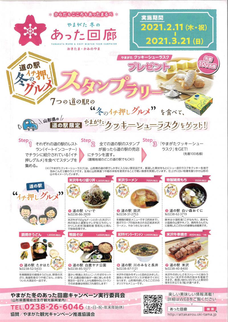 山形県置賜地方の7つの道の駅の"冬のイチ押しグルメ”を食べて、山形県道の駅限定【やまがたクッキーシューラスク】がもらえる(先着100名様)スタンプラリーを開催!