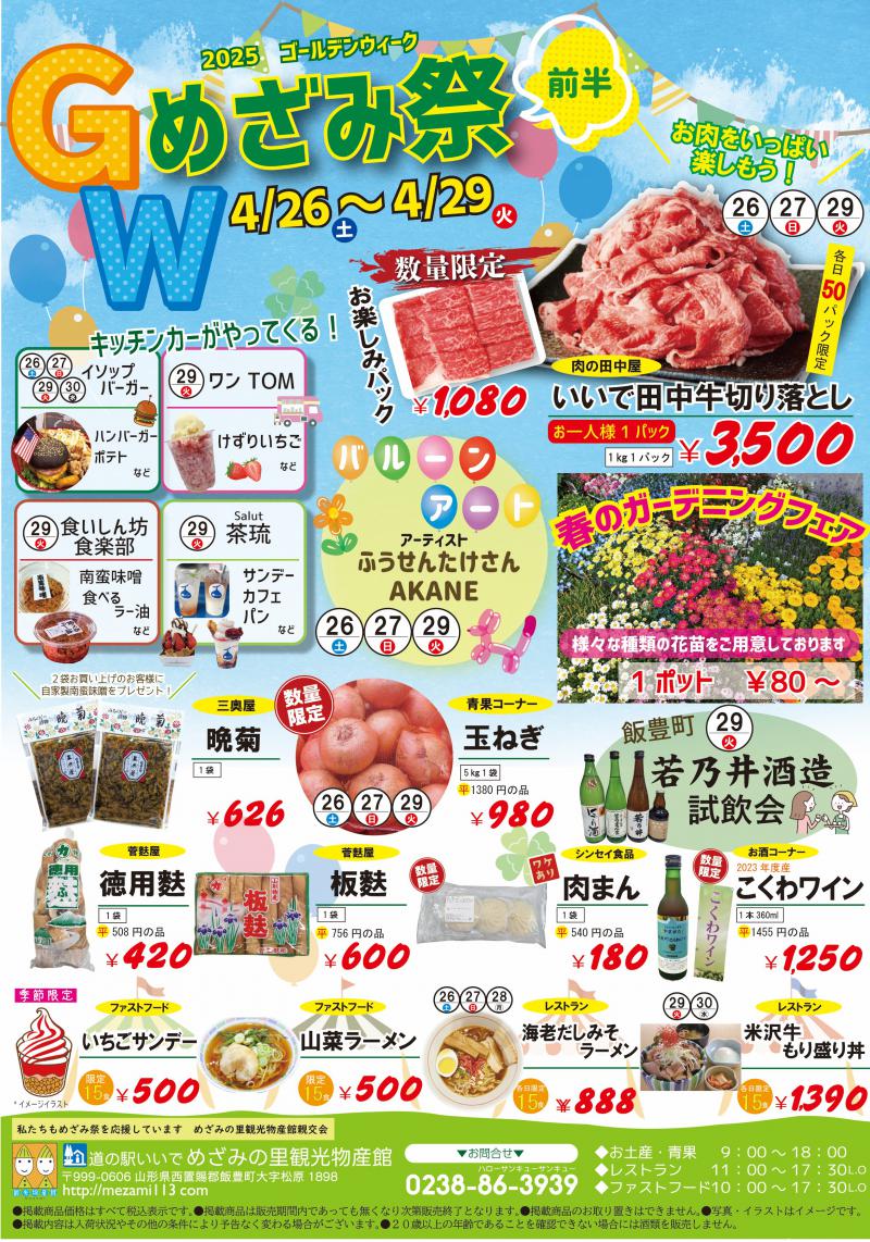 明日4/26〜29までゴールデンウィーク前半めざみ祭を開催いたします!大人気の田中牛をはじめ、さまざまな種類の花苗の販売や地酒の試飲会、お買い得商品などをご用意して皆様のお越しをお待ちしております!