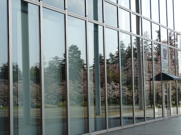 休館中の伝国の杜の全面ガラス窓に映る桜です。