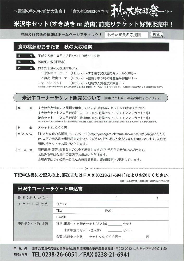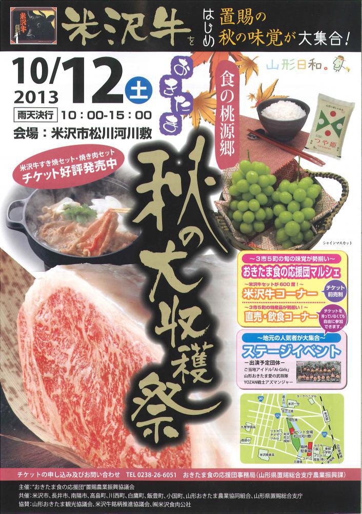 食の桃源郷おきたま秋の大収穫祭開催!置賜の旬の味覚が勢ぞろい!米沢牛コーナー直売飲食コーナー入場無料日時 平成25年10月12日(土)10:00〜15:00 多彩なステージイベント!ai-girls山形おきたま愛の武将隊yozan戦士アズマンジャー ・米沢牛まつり米沢牛すき焼きセット、焼肉セットのチケットも好評発売中!日時 平成25年10月12日(土) 10:00〜15:00場所 松川河川敷(米沢市)雨天決行詳細 おきたま食の応援団 米沢牛まつり!秋空の下、七輪と炭火で米沢牛最高級ロースのすき焼きを食べる!または米沢牛の焼肉セット参加料 2人分 6,000円おきたま食の応援団 置賜3市5町から自慢の美味しいものが一堂に集結!ステージイベントではai-girls愛の武将隊アズマンジャーイベントも盛りだくさん!ぜひご来場ください!