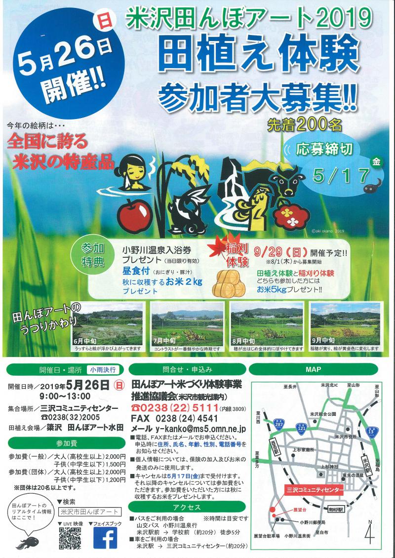 田んぼアート「田植え体験」今回は、全国に誇る米沢の特産品を描きます。応募のあった作品から協議会で検討し、選出された作品を描きます。応募いただいた原案をもとにクレヨンマキさんにアレンジしていただきました。募集期間 5月17日(金)まで※なお、定員になり次第締め切らせていただきます。山形県米沢市の小野川温泉に程近い水田をキャンバスにし地元特産米と色彩の異なる古代米を植え付けます。稲の様子は、近くの高台に設置する展望台から一望できるほか米沢農業まつりホームページからライブ映像をご覧いただけます。このたび、田植え作業を行ないますのでぜひご参加ください!参加特典 昼食付き(地元産米のおいしいおにぎりと豚汁、お茶) 収穫したお米2kgをプレゼント! (稲刈り体験にも参加していただいた方には合わせて5kg)稲刈り体験は9月29日(日)開催予定!小野川温泉の入浴券プレゼント(当日のみ有効)詳しくは公式ホームページ米沢農業まつりhttp://umai-yone.sakura.ne.jpをご覧ください。上記ホームページからE-mailでも受付中■開催日 令和元年 5月26日(日曜日) □ 9:00〜 9:30 参加者受け付け □ 9:30〜10:00 開会式・現場移動 □10:00〜12:00 田植え作業 □12:00〜12:50 昼食・休憩 □12:50〜13:00 閉会式・解散■集合場所 三沢コミュニティセンター■田植え会場 市内簗沢地内「田んぼアート水田」参加要項■参加費 一般大人(高校生以上) 2000円 子供(中学生以下) 1500円 団体大人(高校生以上) 2000円 子供(中学生以下) 1200円団体扱いは20名以上 ■募集人数 先着200名■持ち物 サンダル、タオル、着替え、敷物、雨具など 田植え作業は裸足で実施します。 汚れてもよい服装で参加して下さい。■問合せ・申込み 田んぼアート米づくり体験事業推進協議会 山形県米沢市商工観光課内 電話 0238−22−5111 FAX 0238−24−4541 または 電子メールにて受付致します。 y-kanko@ms5.omn.ne.jp※申込み時は、住所・氏名・年齢・性別・電話番号 メールアドレス(任意)をお知らせ下さい。※お申し込みいただきました個人情報は田んぼアート米作り体験事業のために利用します。それ以外には一切使用しません。※キャンセルにつきましては5月17日まで受け付け致します。 それ以降のキャンセルにつきましては参加費を徴収いたします。 なお、参加費をいただいた方には収穫したお米「つや姫」を プレゼントいたします。