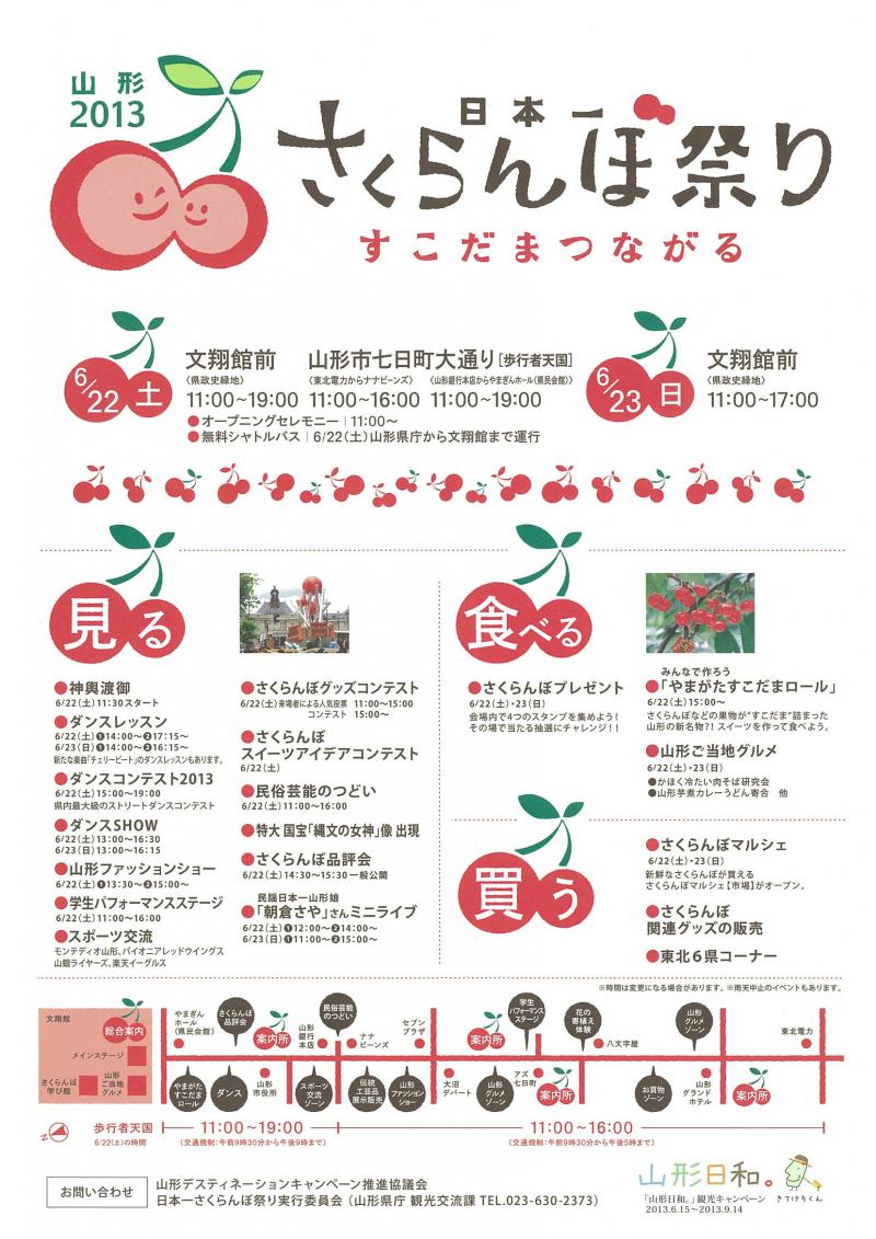 6月22日(土)〜23日(日)に行われる「日本一さくらんぼ祭り〜すこだまつながる〜」の物産展に、南陽市が出店します。(22日のみ)場所は山形文翔館。2日間様々な催しが行われるようですので、ぜひ足をお運びください♪