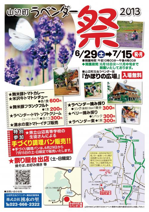 山辺町の玉虫農村公園かほりの広場ラベンダー園で開催されるラベンダー祭2013もいよいよ今週末開催となりましたヽ(・∀・)ノ村山地方のみならず、県内は百科繚乱・花イベント満載の時期となり、何処にお出かけしようか迷ってしまう今日この頃ですが山辺一押しは何と言ってもラベンダー園です。山辺町の山間地域にあり、澄んだ空気と心地よい気候は、ストレス社会に晒される大人はもちろん小さなお子様まで、疲れたココロとカラダを癒してくれる空間となっております。家族・恋人はもちろん、お一人様も大歓迎!紫色の小さな花達と園内スタッフ一同が皆さんのお越しを心からお待ちしております。今週末は、『みんな』山辺町ラベンダー園にLets GO!あっ!…、イベント期間中の週末には地元高校(山辺高校生徒)による『手作りパン』の販売や屋台の出店がある他、山辺町特産品「舞米豚」と「健康トマト」を使用した『トマトカレー』・ラベンダーソフトクリーム等を味わうことができるのでお楽しみに( ´艸`)園内にはラベンダーの他にもグミの木やベリーが植えられており、摘み取りすることができます。近隣には作谷沢の湧水スポットや県民の森がありますので立ち寄ってみるのも楽しいですよ!※写真は2013.6.22現在の状況です。