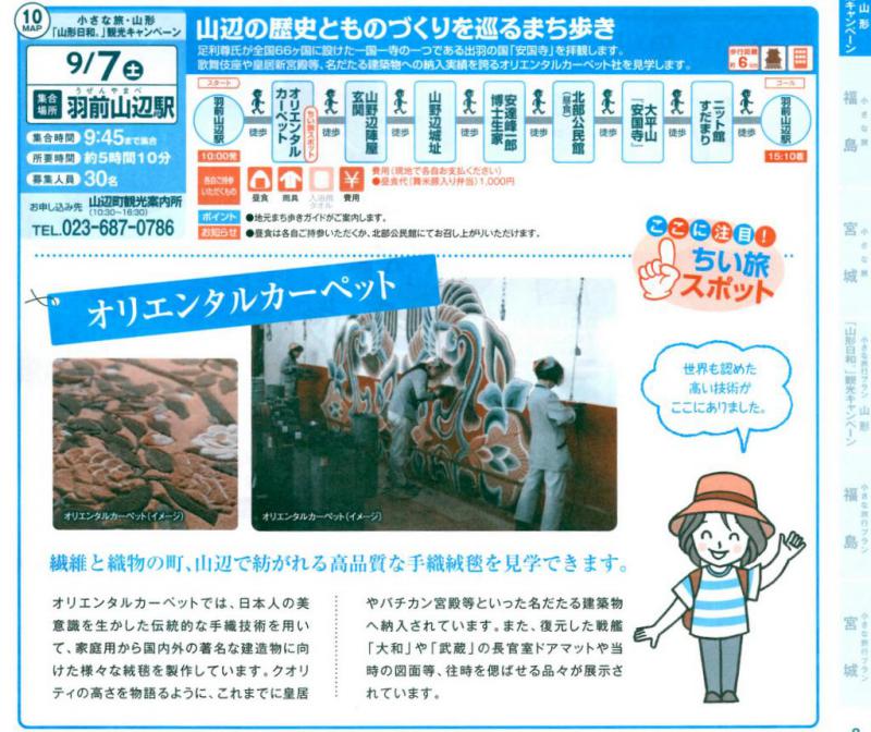 「山形日和」観光キャンペーンの一環として、JR左沢線「羽前山辺駅」を出発地に山辺町内の史跡や見どころを歩いて巡る、まち歩き企画を実施します。開 催 日 平成25年9月7日(土)集合場所 羽前山辺駅(9:45集合)参 加 費 無 料コ ー ス 添付の画像ファイルを参照ください。(歩行距離約6km)お申込み 山辺町観光案内所すだまり(10:30〜16:30)電話 023(687)0786そ の 他 当日は、JR左沢線沿線をSL「山形日和。」号が走ったり、町内の本町通り(駅付近)で開催予定のイベント「くう飲むあそ部フェスタ」などで賑わいます。
