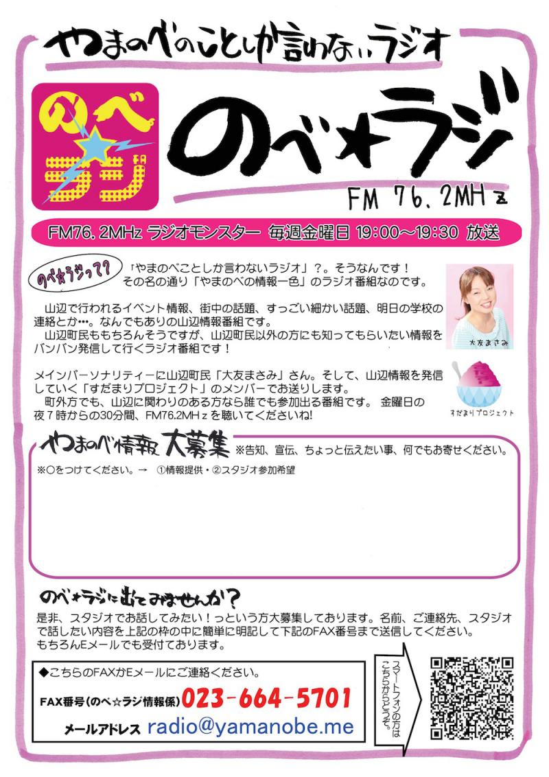 また、[のべ★ラジ]では告知や宣伝、伝えたい事などの「やまのべ情報」と「スタジオで直に話をしたい方」を募集しています。