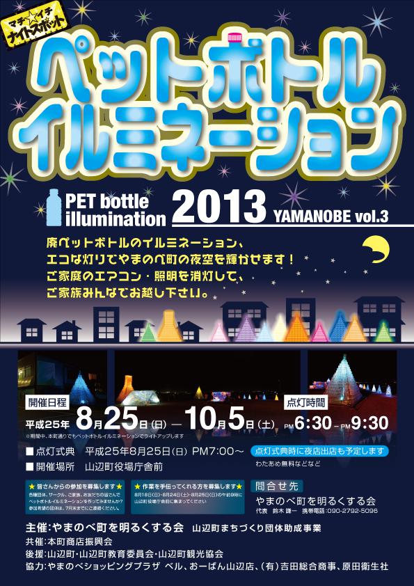 今回で3回目を迎えるペットボトルイルミネーション。今年は更にパワーアップして山辺の夜空を灯します。■開催期間 8月25日(日)〜10月5日(土)■点灯時間 18:30〜21:30■点 灯 式 8月25日(日) 19:00〜■会 場 山辺町役場前駐車場付近■そ の 他 点灯式当日は、わたあめ・ポップコーンのプレゼント有り(無くなり次第終了)また、作業をお手伝いをしてくれるボランティアスタッフ&ペットボトルイルミネーションを製作してくれるグループ・企業を募集しております。ひと夏の思い出を一緒につくりませんか?お気軽にお問合せください。【作業日時】 8月18日(日)、8月24日(土)、8月25日(日)午前9時に山辺町役場庁舎前に集合ください。(3日間の内の一部のみ参加も大歓迎!!)【問合せ先】 山辺町を明るくする会 代表 鈴木謙一 TEL090-2792-5096 前回2012年の様子 [仙英学園 ゆりかご幼稚園]作品(2012)