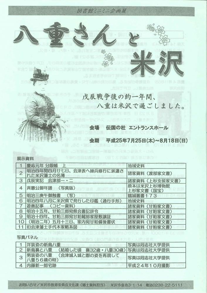 「八重さんと米沢」企画展 資料展示戊辰戦争後の1年間、八重は米沢にいました。会期 平成25年7月25日(木)〜8月18日(日)会場 伝国の杜 エントランスホール米沢藩士 内藤新一郎の備忘録(日記帳)から八重たちが米沢城下の内藤家に約1年間滞在していた事実が明らかになりました。大河ドラマでも米沢での場面が放送されます。ミニ企画展では市立米沢図書館の資料を中心にご紹介します。実物の資料から、米沢での八重さんをさらに身近に感じていただければと思います。