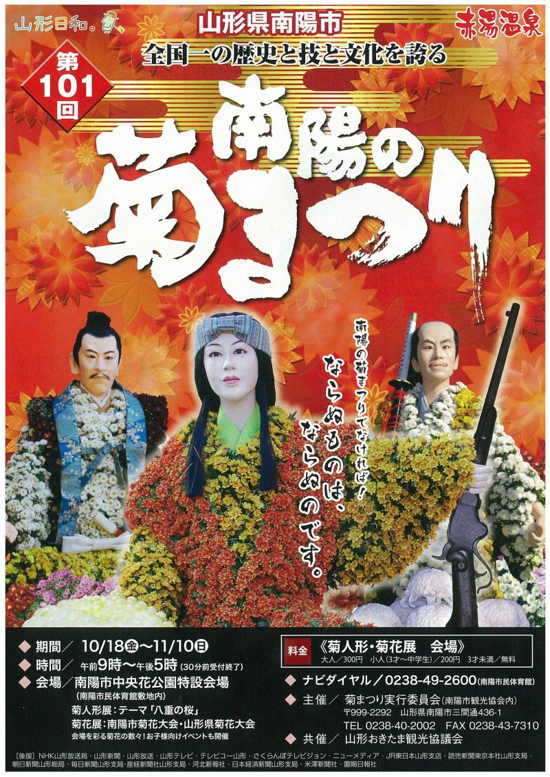 10月18日(金)より「第101回南陽の菊まつり」が、南陽市中央花公園特設会場にて行われます。今年の菊人形のテーマは「八重の桜」。南陽市菊花大会のほか、山形県菊花大会も同時開催されます。