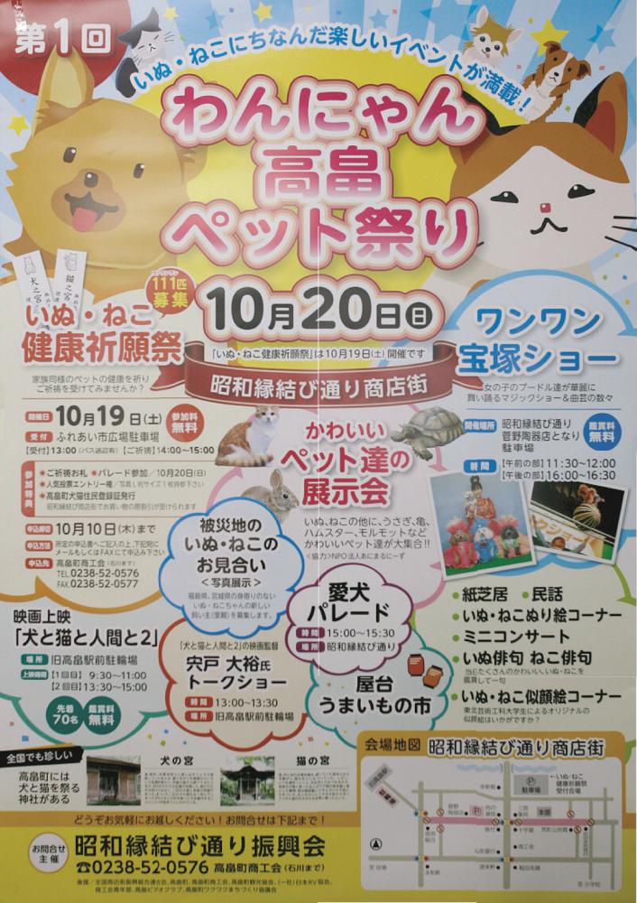 10月19日(土)、20日(日) 昭和縁結び通りにて『第1回 わんにゃん高畠ペット祭り』 が開催されます!! 19日には『いぬ・ねこ健康祈願祭』(事前申し込みが必要)20日はかわいいペットの展示、愛犬パレード映画『犬と猫と人間と2』上映、監督・宍戸大裕トークショーほかイベント満載!!今回が初の開催となる『わんにゃん高畠ペット祭り』、ぜひご参加ください♪ タイムスケジュール(予定)は以下の通りです。9:30〜11:00 映画『犬と猫と人間と2』上映会11:30〜12:00 ワンワン宝塚ショー13:00〜13:30 映画『犬と猫と人間と2』監督・宍戸大裕 トークショー13:30〜15:00 映画『犬と猫と人間と2』上映会15:00〜15:30 愛犬パレード16:00〜16:30 ワンワン宝塚ショー お問い合わせ先昭和縁結び通り振興会 0238-52-0576(高畠町商工会)