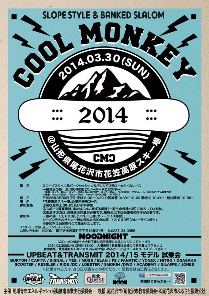 3月30日(日) 尾花沢市花笠高原スキー場にて「COOL MONKEY」開催スロープスタイル&バンクドスラローム 今年・来年モデル試乗会もありますよ参加だけでなく見ごたえたっぷりの大会です 是非遊びに来て 申込・問い合わせ NOON 電話 0237−24−0356