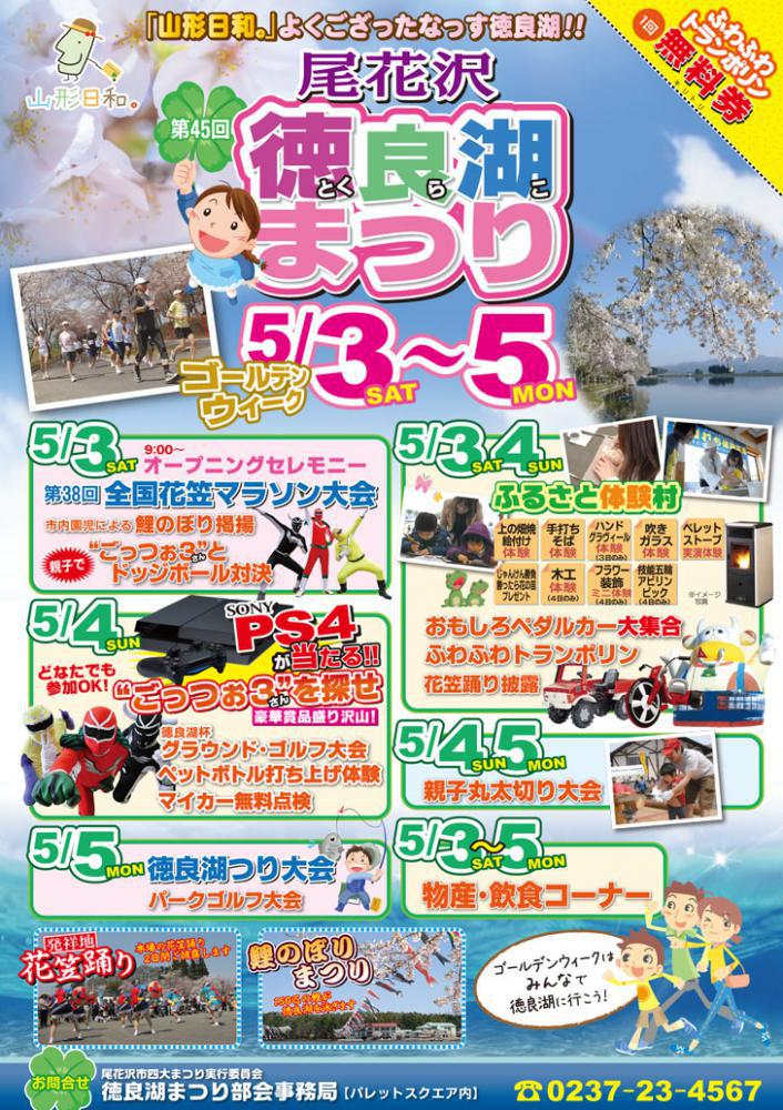 5月3日・4日・5日花笠踊り発祥地「徳良湖(とくらこ)」周辺を使って祭り開催です毎日楽しいイベント盛り沢山 是非GWのお出かけ下さいね詳しくは尾花沢市観光物産協会HP「徳良湖まつり」