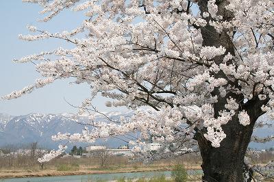 ▲残雪の朝日連峰と最上川と桜のコラボレーションは、長井の“今”しかない自慢の風景なんです(*^^)v