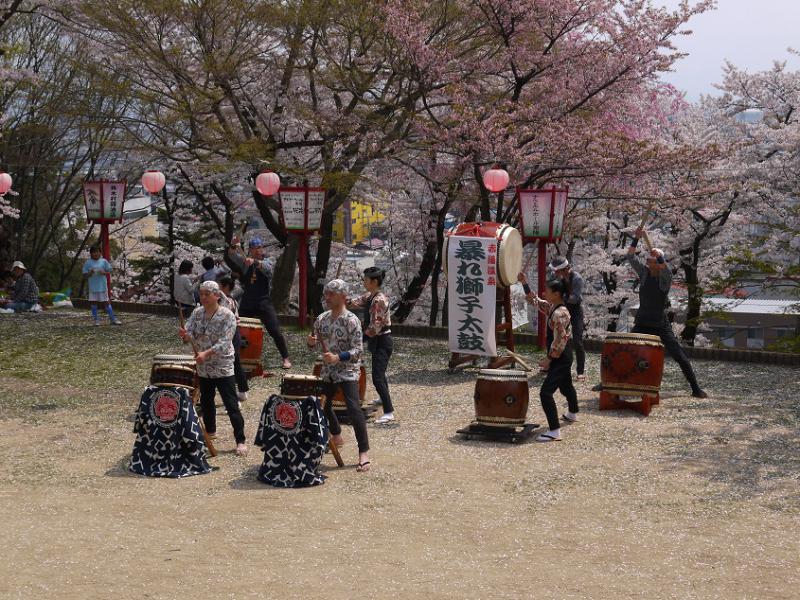 27日に烏帽子山公園では、伝統芸能「赤湯温泉暴れ獅子太鼓」が披露されました。当日は晴天で満開と、最高のロケーションでした。