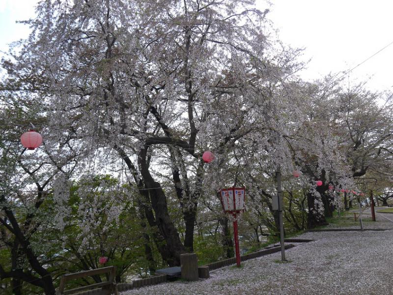 見頃が過ぎ、ほとんど葉桜の状態ですが、シダレ桜が少し、八重桜や黄桜が咲いています。花びらが地面にいっぱいです。