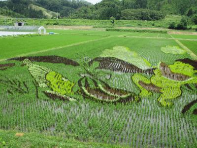 今年で2回目の田んぼアート規も大きくなりましたスイカ太郎君を優しく見守る老夫婦そして山形DCキャンペーンマスコット「きてけろ君」も登場しました尾花沢新庄道路尾花沢北出口で降りて13号線を北上し歩道橋手前の信号を右折細い道を入ってください(元名木沢小学校裏手)となりますこれから形もはっきりしてきます是非見に来てください