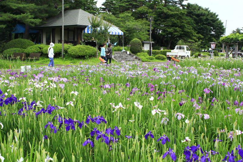 あやめ公園解説 あやめ公園の歴史は、明治43年に長井市横町の金田勝見という人物が清水湧く野川の川べりに茶店を開き、そこに数十株の花菖蒲を植えたところから始まります。 明治45年には国鉄の誘引をはかり、杉林を伐採した空き地に花菖蒲を植え、現在の公園の原型が作られましたが… その後の昭和18年、第二次世界大戦時に極度の食糧難からあやめ公園は増産畑へと姿を変えることとなります。抜き取られたあやめの苗は町内へ配布され、これを惜しんだ方々があやめの苗を保存し、戦争が終わって落ち着きを取り戻したころ、「あやめ公園」の復興へとりかかり、昭和26年頃にようやく見れるまでに復活したのです。 昭和37年には日本花菖蒲協会の井上清会長、平尾秀一理事長など30余名が来園、この時後に「長井古種」と呼ばれる非常に珍しい花菖蒲が発見されました。昭和38年には明治神宮から江戸系花菖蒲20種200株を譲り受け、その協力があって見事な復興を果たし、現在では3.3ヘクタールの面積に500種100万本の花菖蒲が植栽される、日本でも有数の花菖蒲の公園となっています。 山形デスティネーションキャンペーン「山形日和」本年度はJR6社と地元の観光関係者や自治体が一体となって展開する