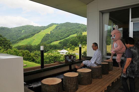 大自然を満喫できる朝日自然観。施設裏の山々から湧き出る「わさび水沢」の湧水を利用した冷し足湯が始まりました。目の前の雄大な自然を眺めながらリラックスできます。