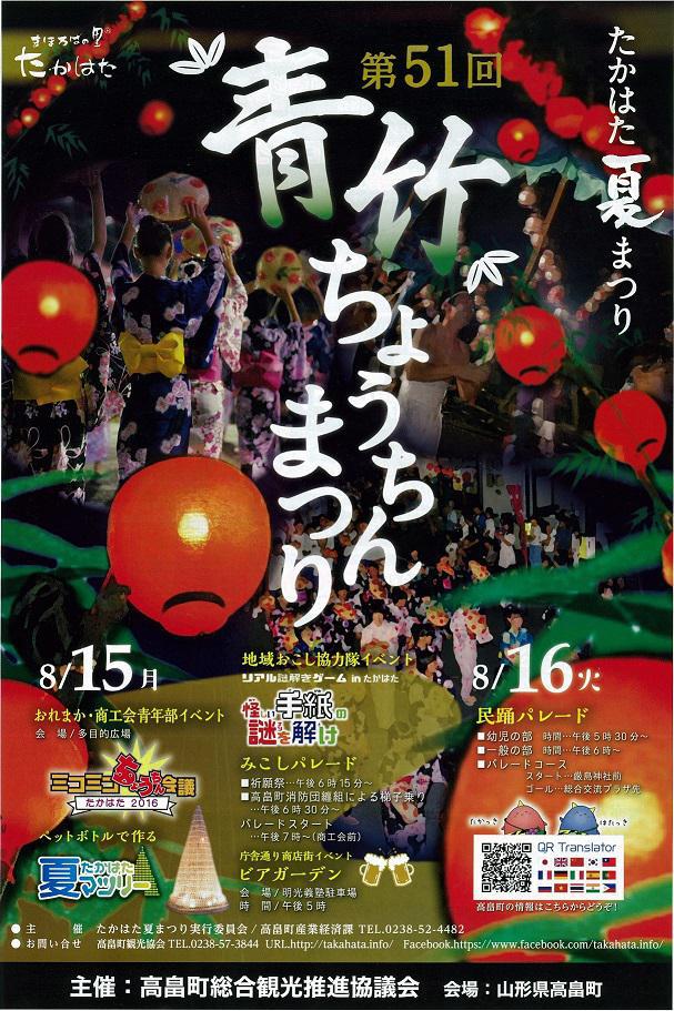 8月15日、16日の両日、第51回青竹ちょうちんまつりが開催されます。15日は「みこしパレード」16日は「民踊パレード」今年も、楽しいイベント盛りだくさんで開催します。(詳細はPDFをご覧ください)皆様、是非お越しください。※会場内での小型無人機「ドローン」の使用はご遠慮ください。