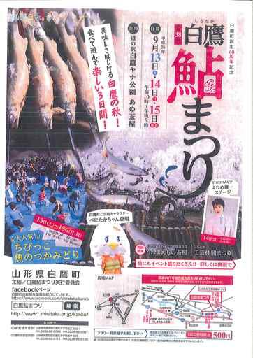 9/13(土)〜15日(月・祝)の3日間開催されます。ちびっこ魚つかみどりをはじめイベント盛りだくさんでお待ちしています。白鷹町ご当地キャラクター「べにたかちゃん」も来ますよ!詳しくは、トップページのバナーをクリックしてご覧ください。
