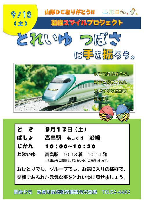山形DCありがとう!! 沿線スマイルプロジェクトと題してJR高畠駅で「とれいゆ つばさ」に手を振ろう。イベントを開催します。期日 9月13日(土)場所 JR高畠駅もしくは沿線時間 10:00〜10:20たかっき・はたっきも参加します。皆様、一緒に盛り上がりましょう!