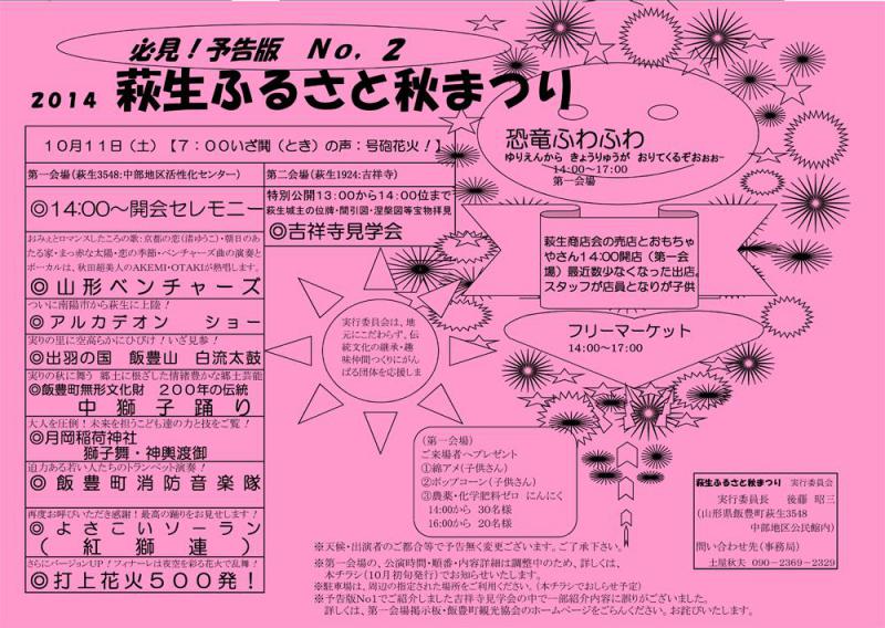 (タイトルは予告版Aチラシです)チラシのダウンロードは下より。予告版Aチラシ お疲れ様です♪9月に入り朝晩寒くなってきましたね・・・皆さん、風邪など引いてないでしょうか?どーも、鼻水が相変わらず止まりません!!オノです(T^T) 今日は、10月11日(土)に開催される2014 萩生 ふるさと秋まつりの予告第2弾です♪ 以下の内容は天候・出演者のご都合等で変更もありますm(__)m メイン会場は、飯豊町 中部地区活性化センター14:00〜開会セレモニー♪その後、7つの団体によるステージ!フィナーレには打ち上げ花火となる予定です(^o^)/ また、メイン会場では萩生商店街の売店とおもちゃ屋さん♪ 子供が中に入って遊べる恐竜型ふわふわ! フリーマーケット!! 来場者プレゼントも企画されている様です(≧ω≦)b お問い合わせ♪事務局(土屋) TEL 090-2369-2329 以上、オノでした(*゚▽゚*)また情報が入り次第報告します(*`д´)b Tweet!function(d,s,id){var js,fjs=d.getElementsByTagName(s)[0],p=/^http:/.test(d.location)?'http':'https';if(!d.getElementById(id)){js=d.createElement(s);js.id=id;js.src=p+'://platform.twitter.com/widgets.js';fjs.parentNode.insertBefore(js,fjs);}}(document, 'script', 'twitter-wjs');