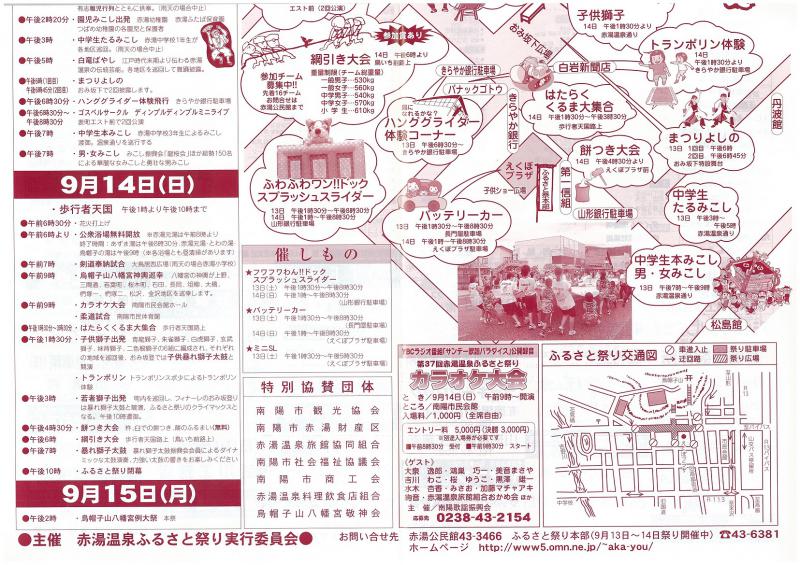 9月13日(土)、14日(日)に「赤湯温泉ふるさと祭り」が行われます。初日には華麗な「女みこし」と勇壮な「男みこし」、2日目は迫力ある「若者獅子」が街を練り歩きます。ぜひご覧ください。