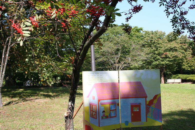 白つつじ公園の遊具の南側の道を西に進むと、絵本が始まります!