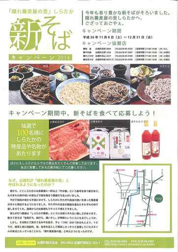 11月8日(土)〜12月31日(水)新そばキャンペーンを開催中です。白鷹の隠れ蕎麦屋の熊屋、千利庵、のどか村、宝思そばの各店に設置してある応募用紙にてご応募ください。抽選で100名様にしらたかの特産品や名物があたります。新そばを食べにぜひ白鷹へおいでください。(K)