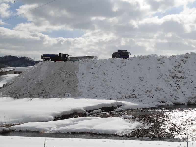 川を挟んだ向こう岸から撮影すると、どのくらいの雪が運ばれてきたのかよくわかりますね(・。・;