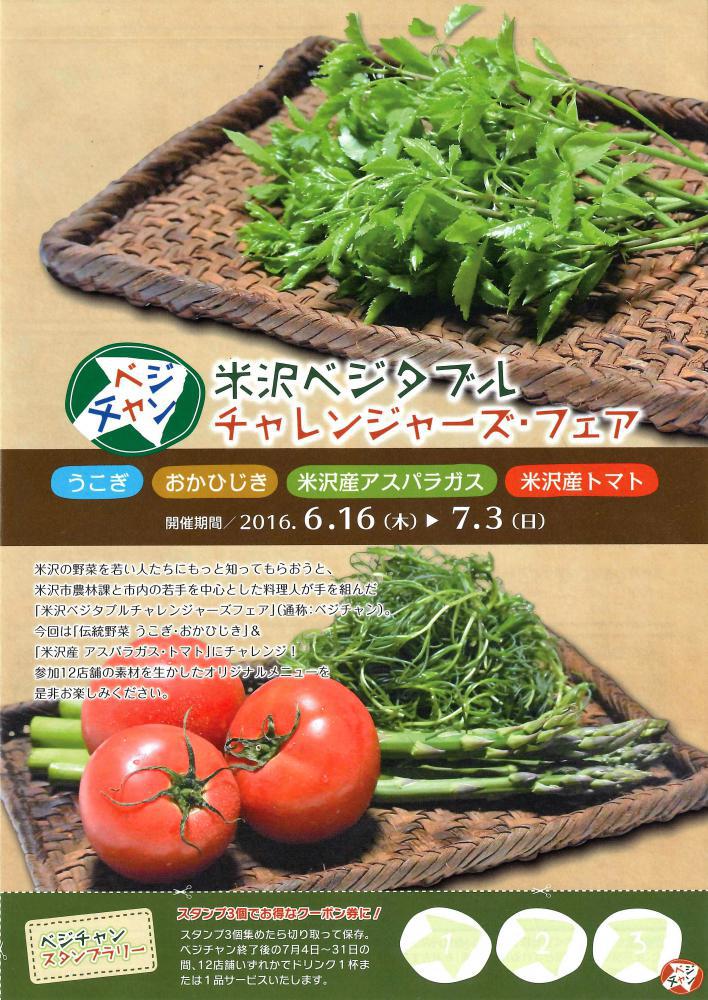 6月16日(木)より、『米沢ベジタブル・チャレンジャーズ・フェア』 が開催されます。米沢の伝統野菜や季節のおいしい野菜を使って、米沢市内の若手料理人がアイディアたっぷりの料理にチャレンジする「米沢ベジタブル・チャレンジャーズ・フェア」が開催されます。今回の食材は、うこぎ、おかひじき、米沢産アスパラガス 米沢産トマトです。居酒屋、ダイニング、イタリアンと気軽に入れるお店ばかり。期間中、各店舗でオリジナルメニューをお楽しみください。米沢ベジタブル・チャレンジャーズ・フェア■開催期間:6月16日(木)〜7月3日(日)■参加店舗:【スープカレーらあじゃ】 米沢スパイス うこぎのドライカレー 野菜オールスター 米沢スープカレー【Dococa coffee】 うこぎと甘納豆の和ドーナツ トマトとフレッシュバジルの冷製マリネパスタ【cafe towa】うこぎのデトックスチーズケーキ アスパラのレモンパスタ【タントグラッツェ】 フレッシュトマトのミートソース うこぎのジェノベーゼ風ソースを添えて とろーりモッツァレラのポークカツレツミルフィーユ仕立て【ラ・スカルペッタ】 うこぎのブリオッシュ・コン・ジェラート おかひじきとムール貝のイカ墨パスタ ボッタルガ(からすみ)を掛けて【ポモドーリ】 うこぎとあさりの冷製カッペリーニ 夏野菜と鶏モモ肉のソテー【こんどう】 里の味 うこぎの豆腐田楽 旬菜とトマトのすり流し寄せ【お菜ところ さわらび】 うこぎと胡桃のソース掛け 米沢鯉の唐揚げ おかひじきの鳥の巣見立て【金熊食堂】 うこぎの金熊特製ポテサラ トマたまスープ【ダイニングバー 時歩里(じぶり)】 うこぎ入りとろとろオムライス 極太蒸しアスパラの梅ジュレ掛け【一魚一会 河岸や(かしや)】 うこぎのさんが焼き茶漬け 真鯛とアスパラのスティック春巻き【ダイニング 海豚(いるか)】 うこぎとカマンベールのアヒージョ おかひじきとこうじ納豆の玉子焼き