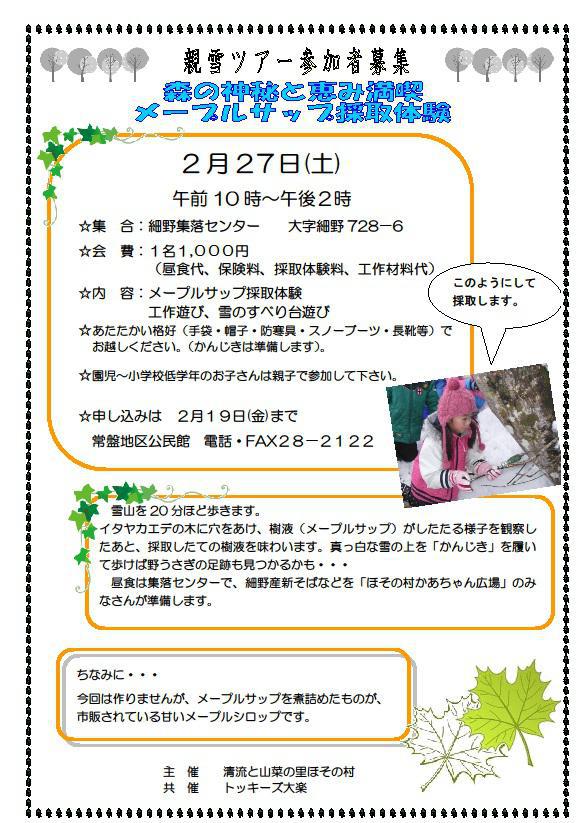 平成27年 2月27日 (土)午前10時〜午後2時☆集 合:細野集落センター 大字細野728−6☆会 費:1名1,000円(昼食代、保険料、採取体験料、工作材料代)☆内 容:メープルサップ採取体験 工作遊び、雪のすべり台遊び☆あたたかい格好(手袋・帽子・防寒具・スノーブーツ・長靴等)☆園児〜小学校低学年のお子さんは親子で参加して下さい☆申し込みは 2月20日(金)まで常盤地区公民館 電話・FAX28−2122メイプルサップとは イタヤカエデの樹液 煮詰めるとメイプルシロップになるものですよ 雪国の自然の恵み 自然のしづく いただきにいきましょう〜 たった1日限定のイベント 雪山を20分ほど歩きます。イタヤカエデの木に穴をあけ、樹液(メープルサップ)がしたたる様子を観察したあと、採取したての樹液を味わいます。真っ白な雪の上を「かんじき」を履いて歩けば野うさぎの足跡も見つかるかも・・・昼食は、細野産新そばなどを「ほその村かあちゃん広場」のみなさんが準備します